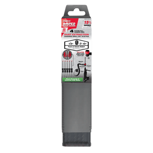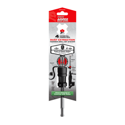 Features Diablo’s exclusive Dura-Carbide™ features up to 2X more carbide that withstands up to 1800°F of intense heat to combat rebar hits versus standard bits that fail at 800°F Patented vacuum system + steel dust sleeve capture dust particles and reduce airborne silica dust to create clean holes ready for epoxy and anchor placement in two simple steps Compact Snap-Lock™ Adapter (sold separately, two versions for SDS-Plus and SDS-Max) connects the AMPED™ Rebar Demon™ Dust Extraction Hammer...